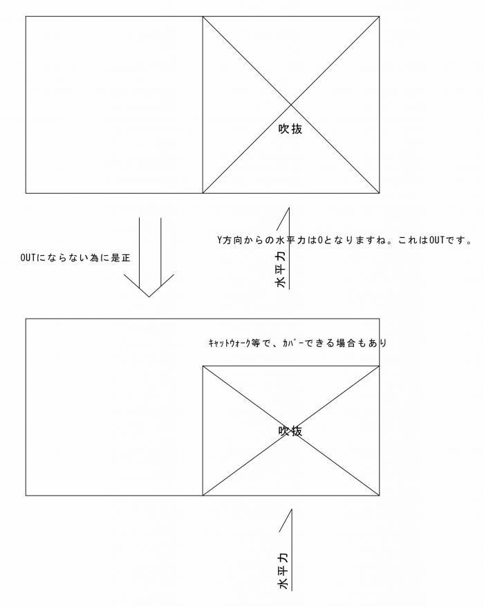 吹抜けの先に階段部分がある場合です。私自身も 4号建築でやってますが、その時は、吹抜に火打梁の設置はして最低限しているのと、この絵で言えば、階段のそのまた先に床があったという形態なので、これよりも全然状況がましだったといえる状況でした。下図の場合は、通路部で、Y方向の水平力をクリアしなければならないので、床面積としてはかなり足りないと想像できます。クリアするには、吹抜けの面積を小さくする か その吹抜けに「コボット」でも使用するか 足りるのであれば通路部の床の耐力を火打ちを追加するなどして強化するかです。