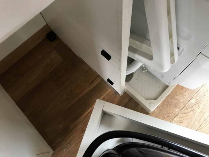 蓋つまみと丁番が出っ張るためワゴン収納側板部につまみ避けガイドの硬質ウレタン材を取付けました。
