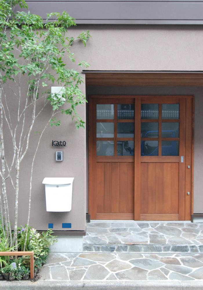 下町の面影を残すこの辺りは敷地いっぱいの建物ですが住まいの周りに緑を配置しとても親密な街路空間となっております。お祭りも盛んで玄関前に祭り提灯を下げ、近所の人たちと神輿の水かけを待ちます。隣通しの立ち話が聞こえるようなそんな場所の住まいの玄関は木製で引戸と施主との共通認識をもち、目線の質感は近隣の古い木造家屋の郷愁に近いものと考え住まい周りに緑を設け、外装を左官塗り、軒裏の板張り、床の石の乱張りとしました。行政による緑化補助金も取得しました。