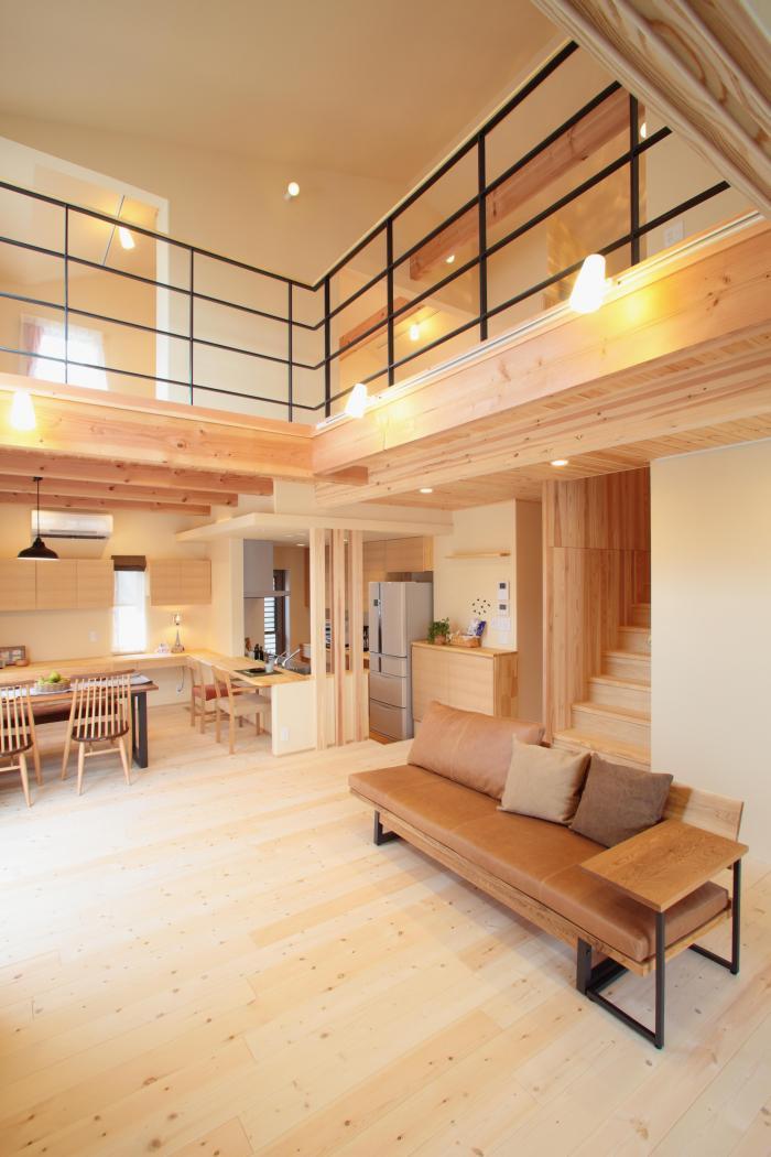床や天井を無垢材で仕上げたリビングです。吹抜けのあるリビングを中心に各部屋を配置し、お互いの雰囲気を感じられる様な空間にしています。