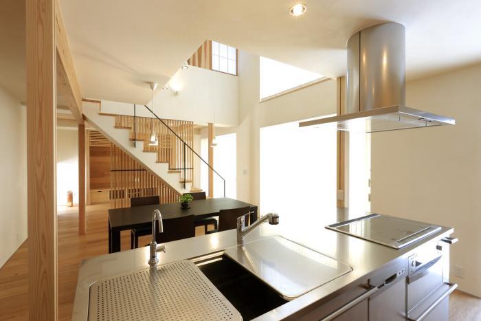 キッチンからリビングまで見渡すと、伸びやかな空間の広がりを実感します。