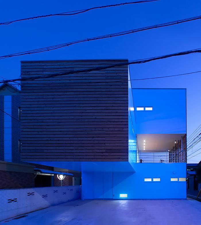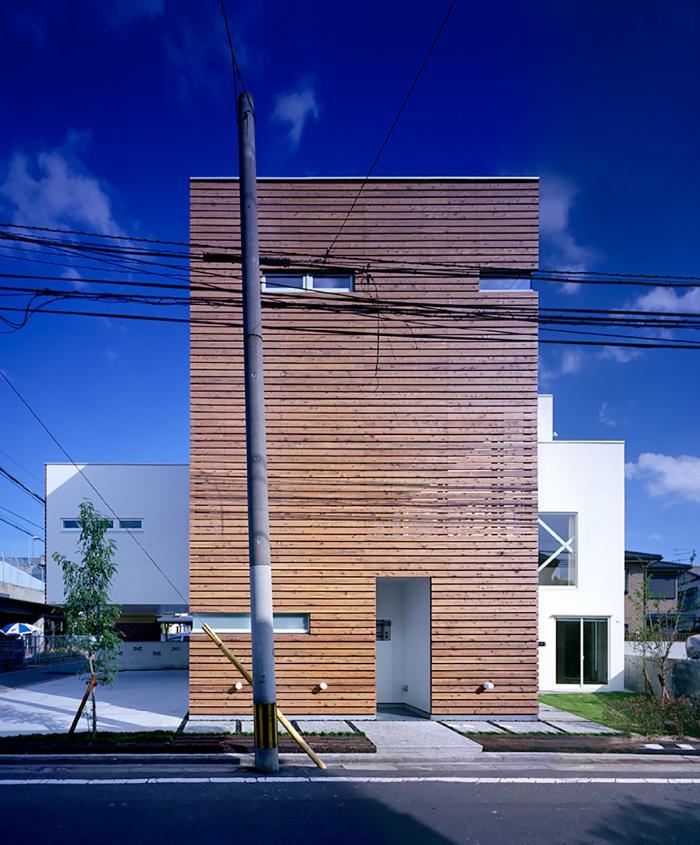 敷地は戸建て住宅の多い住宅地の中の北と西側を道路に接する角地でした。それほど広くないこの土地で、自家用2台を含む計4台の駐車スペースに事務所とオートバイ用のガレージ、住まいにあってはくつろげる空間とたっぷりの収納がほしいという希望がありました。こみあった住宅街の中でともすれば閉鎖的になり易い住宅の姿を、守るべき内部空間の外にふところの深い空間があることで、内部の空間の開放性を確保し、また視線が抜けることで周囲の風景に繋がりとけ込むことを考えました。4.5m持ち出された2階部分の下に出来た軒下空間は、単に吹き抜けた空間と言うだけでない緊張感のある空間となって不容易に近づくことをためらわせます。1階と3階にはさまれた2階テラス空間に紙面の木製ルーバーにより柔らかく守られた空間ができました。これらの2つの異なった表情を持つ空間が、この建物の意志を表現しています。