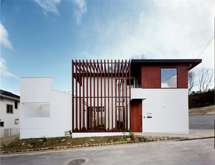 この住まいのシンボルともいえる正面の格子は、軒の水平ラインに対する垂直ラインを表現すると共に、内外の視線を柔らかく遮りつつ、通す役目も持っています。この格子と敷地と道路の高低差を利用して塀の一部をカットしたことにより、公園で遊ぶ子供達の様子を住まいの中から確認できます。また、春には公園の桜を室内に居ながら楽しむことができます。