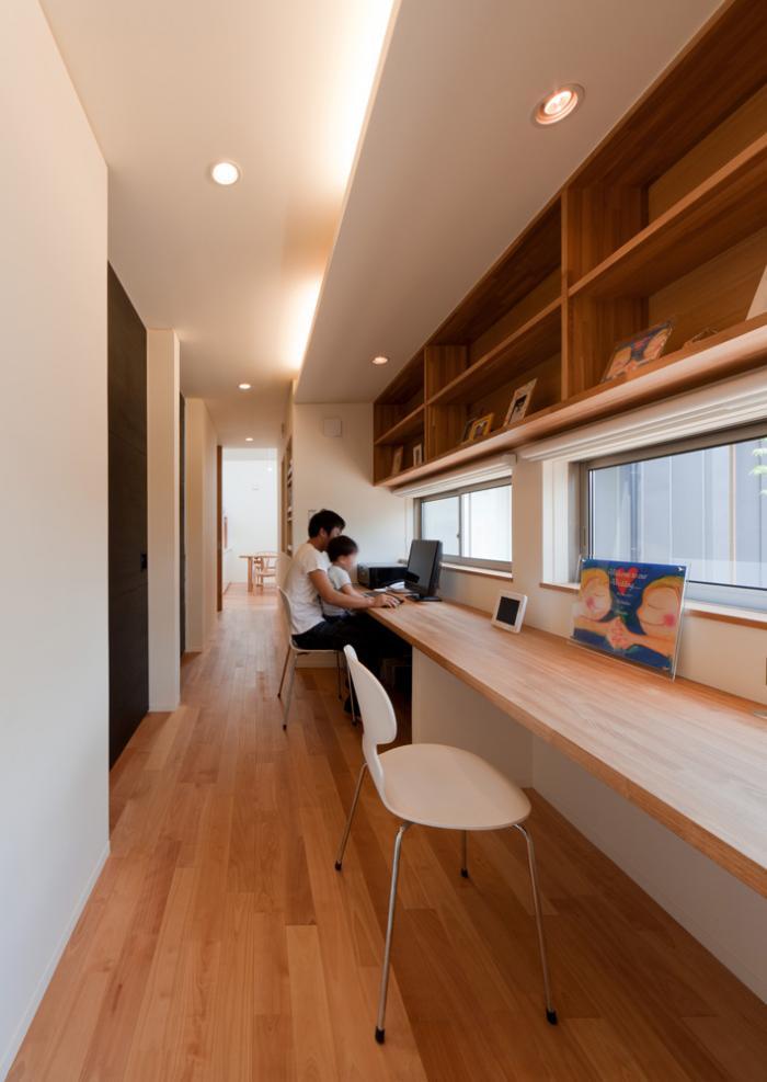 リビングからプライベートスペースへとつながる途中に、ホームステーションを設け、中庭を望みながら、パソコンや読書など落ち着いた時間を過ごすことが出来ます。