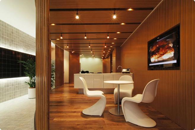 写真は、木に包まれた住宅のように落ち着いた雰囲気の体験・打合せコーナー。