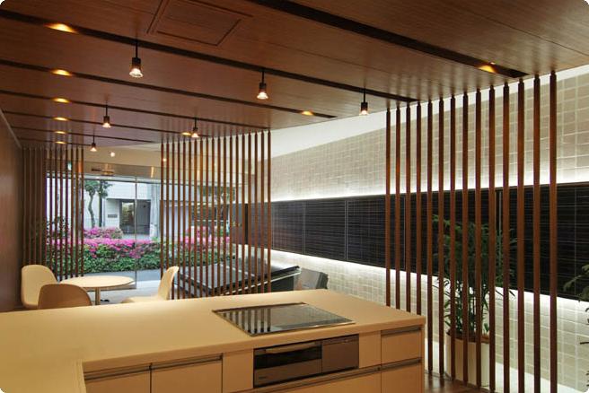 ・外部エリアは石仕上、内部エリアは木仕上。それぞれの雰囲気に合わせた仕上
