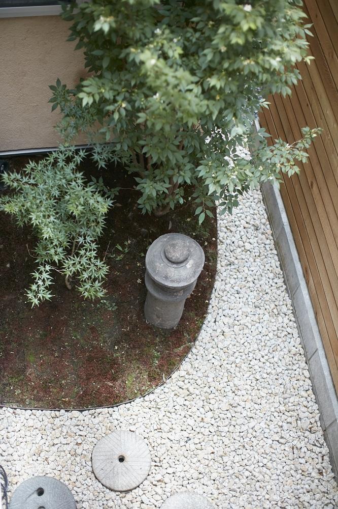 建物の中心にある中庭にはヒメシャラとモミジを植えている。隣地側には木の塀を立ててプライバシーを確保している。
