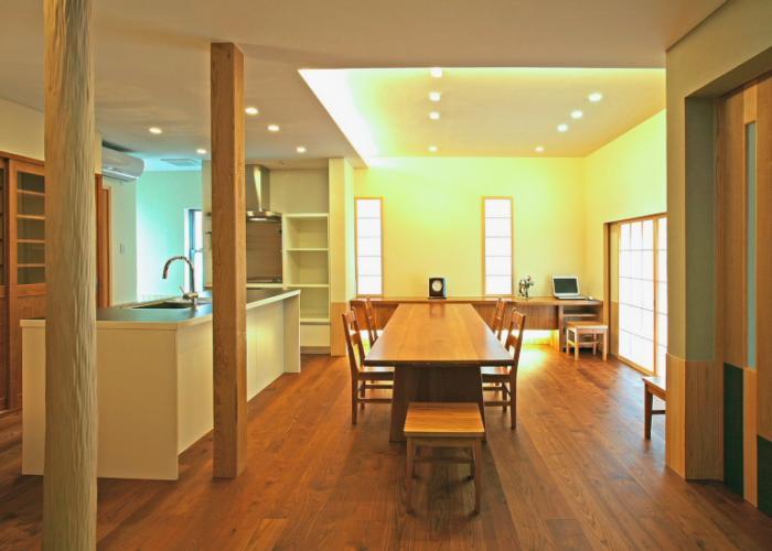 全体的に和モダンな雰囲気で特にリビングは木工家の早川さんに造っていただいたテーブルと壁のカウンターがベストマッチしていて、アイランドキッチンからリビング全体や掃き出し窓の外の庭が見えるのがとても気に入っています。