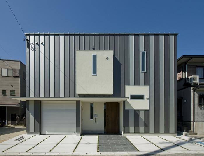 北側道路から見る。グラデーションの外壁はガルバリウム鋼板、タテ平葺き。