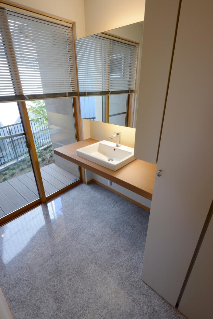 外にデッキがあるグルーミングルーム。脱衣室とは分離しスッキリと使える。