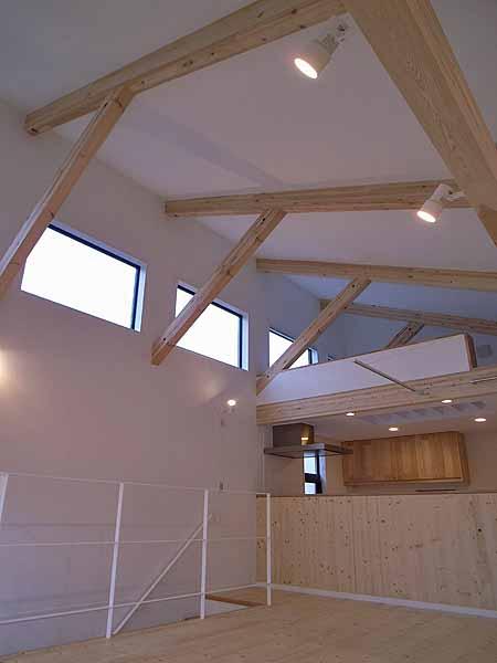 天井の高いリビングダイニング。南向きのハイサイドライトは近隣からのプライバシーを確保しつつ採光と自然換気を実現しています。