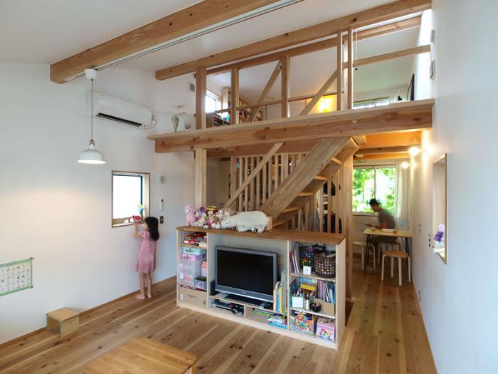 ご夫婦とお嬢さんと2匹の猫が暮す延べ15坪(50m2)の小さな家です。施主は、暮すのに大きなスペースも多くの物もいらないと言います。でもこの家は、小さく感じないしてどこに居ても気持ちいいそうです。2階建+ロフト。