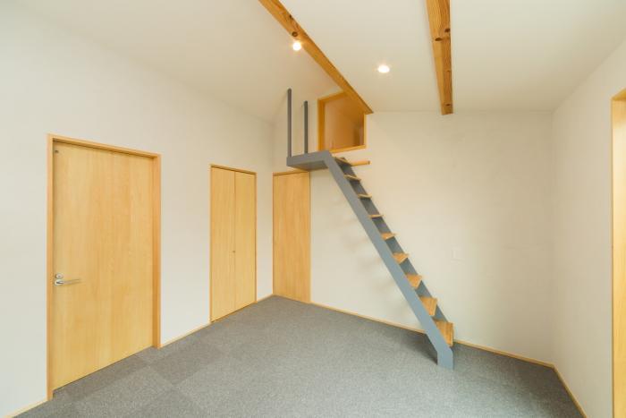 屋根の高さを利用したロフトのある寝室。