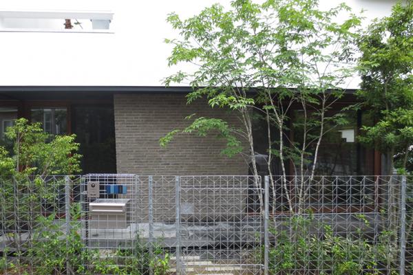 北側ファサード(竣工後)。竣工後はじめて迎えた初夏の様子です。樹々の緑が自然のスクリーンとなり、住人のプライバシーを確保しつつ、周囲に癒しを与えています。2〜3年後には格子状の立体フェンスもテイカカズラの緑で満たされる予定です。