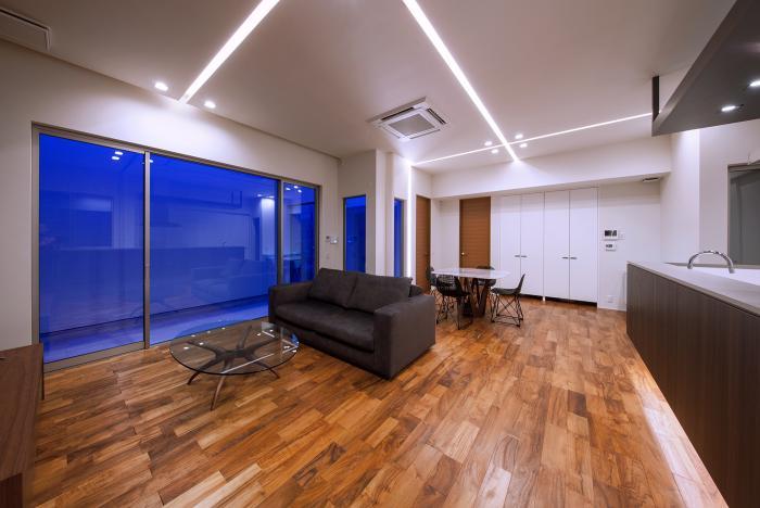 2階リビングの天井の十文字の間接照明は、壁から床まで下がり、キッチンカウンターの間接照明とでリビングにシンプルでモダンな空間を造り出しています。
