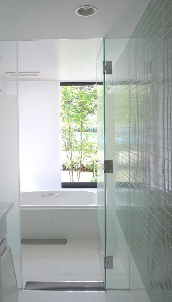 ガラス間仕切りで、浴室と洗面は一体的に広さを感じる。