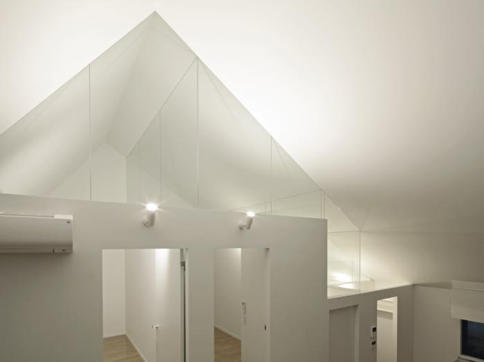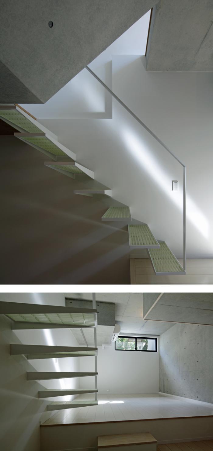 階段は透明FRPの片持ちで視線と光と風が抜ける。上下とも南面する明るい空間で、段差が空間を柔らかく区切り、住み方を工夫できる。