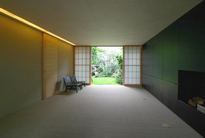 ガラスの向こうのテラスは南庭の池に張り出す。