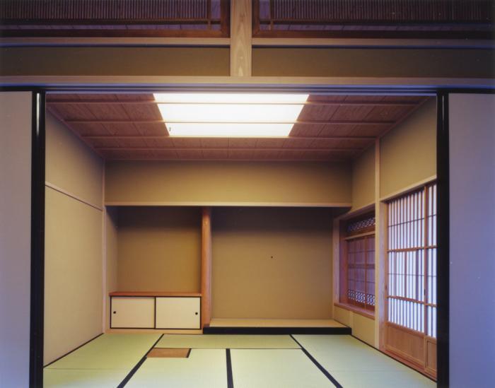 ソファーなどは置かず、座位の生活を希望。和紙貼りの天井は点灯するとスリット照明が出てくる。