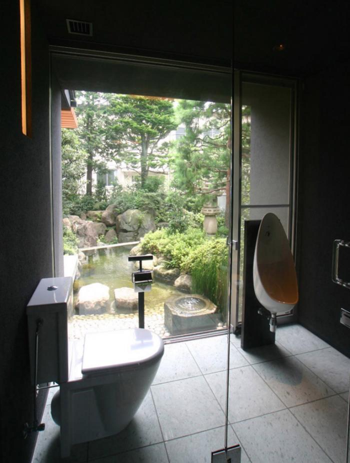 浴室に並ぶトイレも全面ガラス。南庭の池に面する。手前には蹲踞がある。
