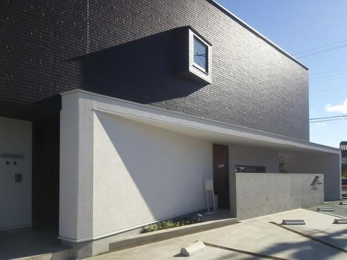 道路側からみた、全景です。寝室の正方形出窓がアクセントとして唯一の窓です。極力、住宅らしさを消しています