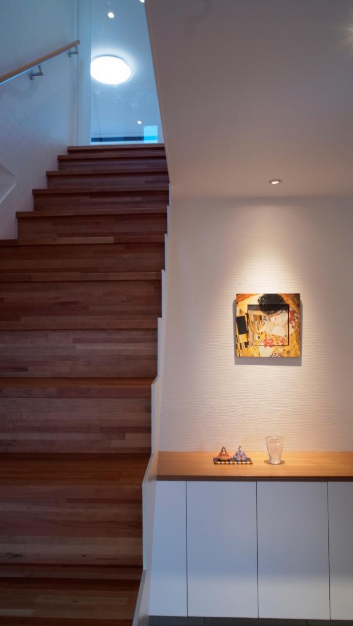 住宅玄関前ポーチです。玄関から、2階へあがっていく階段が見えます