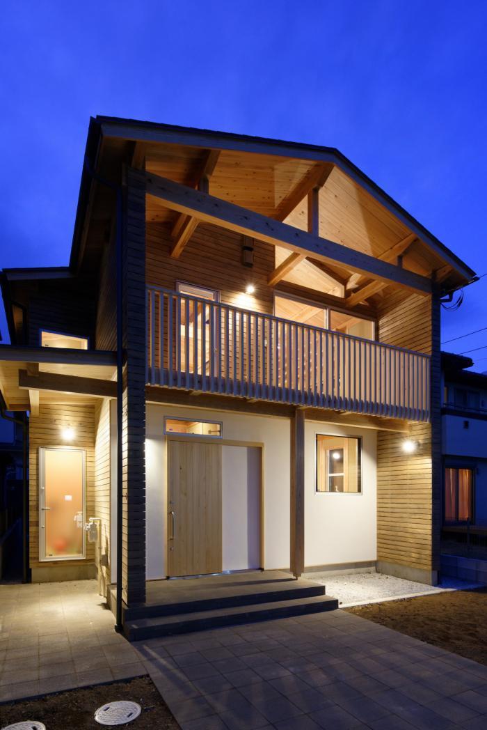 木繊維の断熱材を付加し、杉板をスノコ張りしたルーバーによる繊細で現代的な外観を作り出します。