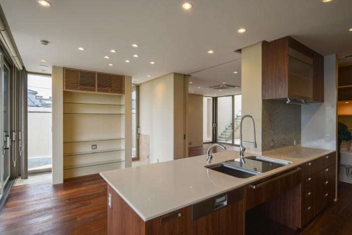 随所に中庭を設けた内に開く住宅で、一番広い中庭には、半透明のファイバーグレーチング製の光を通すブリッジと階段が設置され、中庭から2階のルーフテラスを回遊する事が出来ます。また、塀を構造体と兼ねる事によって、開放的な内部空間を得、その間を外部のスリット空間とし動線、光と風の道として利用しています。 2階のヴォリュームは、平面的に4隅を抉られた十字形の形体になり、1階に比べ大幅に小さくなり住宅のスケール感を抑える事に寄与しています。(植栽工事が未成時の写真です)
