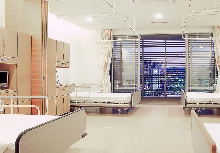 再生木ルーバーで覆われた3階バルコニーは、病室より出入できる安全な外部空間として自然と触れ合う事や回遊性を確保し、交通量の多い通りからの緩衝帯ともなる。また、最上階では、中庭やトップサイドライトにより自然光を取り入れ、開放感のある空間とした。さらに屋上を緑化する事で、散策の場として利用し、再生木の使用、光触媒塗料の大気浄化作用など、環境対策にも配慮した。