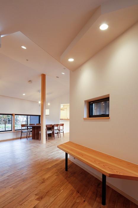 中庭を望める玄関ベンチ、三角アーチの廊下、飾り棚にもベンチにもなる窓台など、住まいとして快適で生活が楽しくなる仕掛けを織り込みました。空間の心地よさが続くよう、内装は無垢材と漆喰、そして自然塗料で仕上げています。