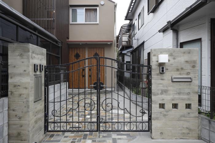 オリジナルのロートアイアン門扉と杉板型枠コンクリート