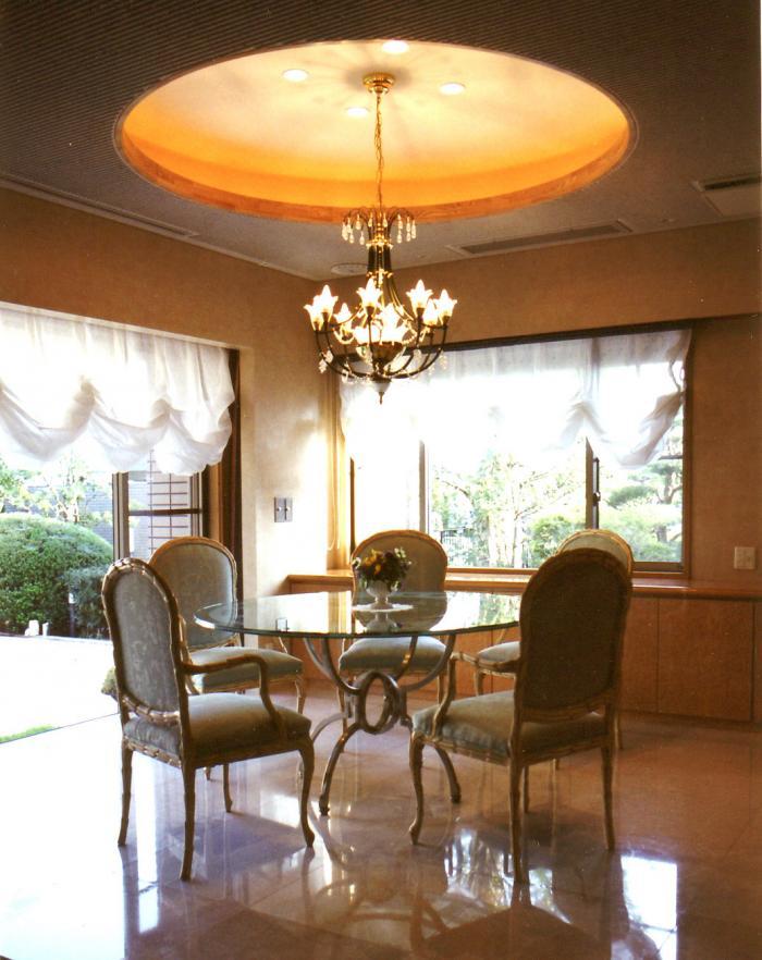 ◇サ-クル状の折上天井と間接照明+シャンデリア