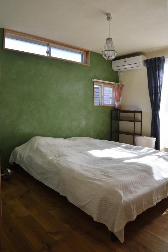 築23年の住宅を娘さんご夫婦+お母様の2世帯で住まうためにスケルトンリフォームしました。写真は2階の娘さんご夫婦の寝室。ヨーロッパのシャビーなインテリアに憧れ、色使い・素材を楽しみたいというご希望でしたので、左官の磨き仕上げとしました。