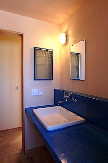 実験用シンクを利用した洗面台。カウンターは左官仕上げとしています。