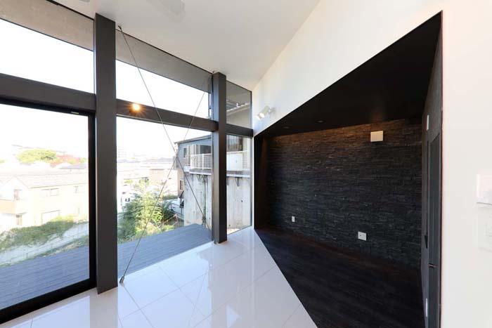 LDKの部屋形状は三角形平面となっており、頂点からLDKにアクセスして、正面の辺の壁面全面をガラスとすることで、眺望をより楽しめるように計画しています。