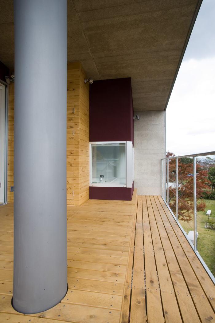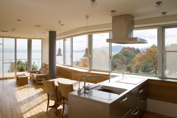 2、3階を居住スペースとして、湖面を臨む東側にデッキを、自然公園が広がる南側には大きな連窓を設ける事で、琵琶湖と周辺の風景を最大限に取り込んだ住空間となっています。