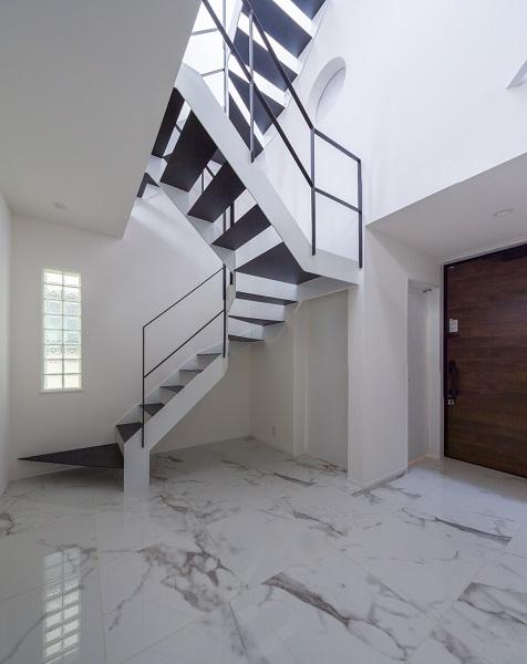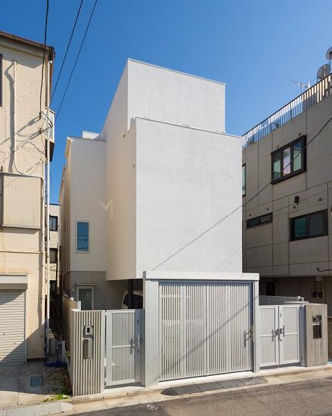 外観はRC打放と白い壁の組み合わせとし、近隣の建物からの視線に配慮して開口部(窓)は最小限にとどめた。夜はライトアップして奥行き感のある佇まいを演出している。
