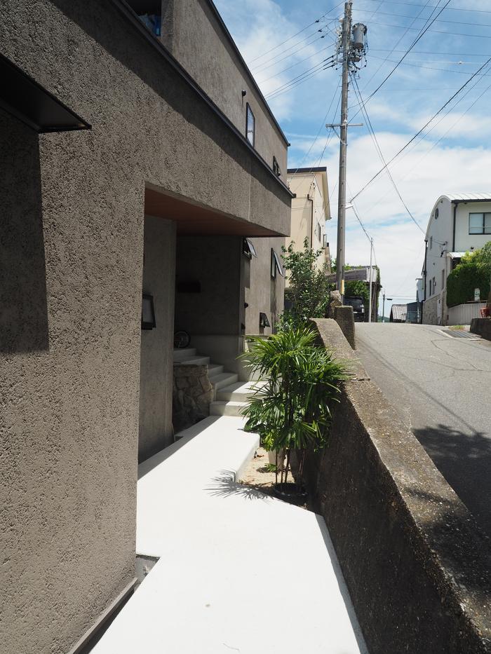高低差のある敷地に建てられた2世帯住宅。「海が見える」という希望を満たす土地には高低差があり昔ながらの擁壁が存在していました。既存の古い擁壁から距離をとって2棟を配置し、その上を繋ぐという構成にしました。