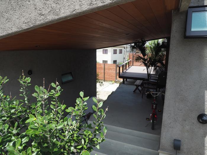 コストを抑えるため、またもともとの風合いを設計に取り込むために、既存擁壁をそのまま残し建物荷重がかからないよう距離をとる建物配置計画としました。高低差をいかし、高い方の敷地1階のリビング・ダイニングからと、2階の主寝室から海が眺められるようプランニングしました。