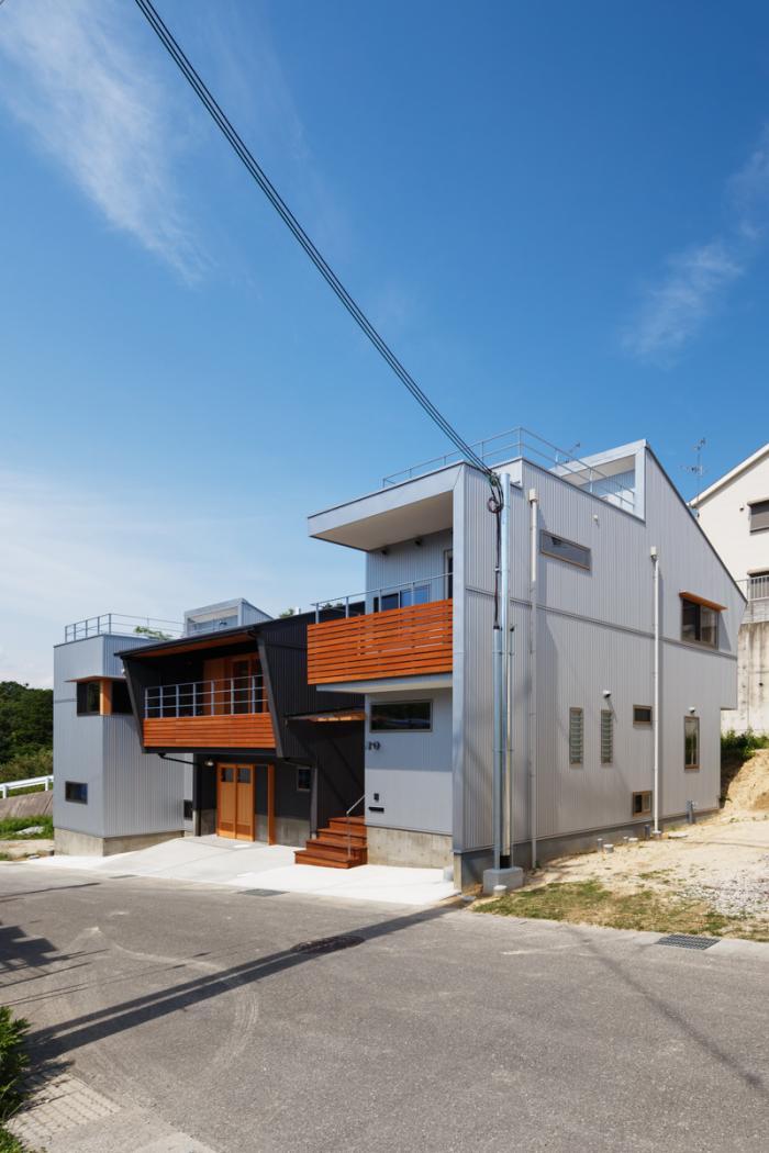 で無機的になりがちな金属板の外壁にやわらかさとアクセントを与えています。