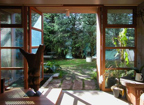 吹抜けスペースをはさんで反対側の部屋(アトリエ)越しに庭を望む。