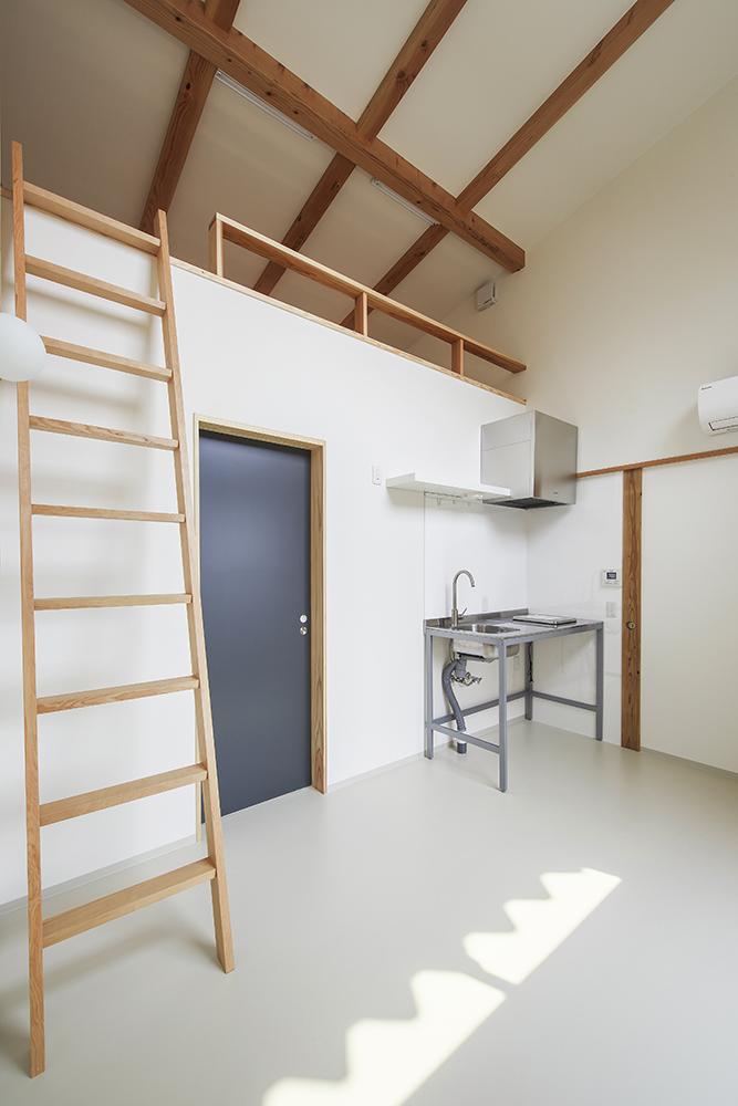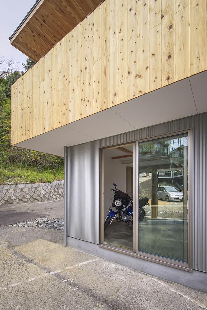 木造2階建て+ロフトの賃貸ガレージハウス。1階の土間スペースは、バイクや自転車のスペースとしてもアトリエとしても使える。2016年グッドデザイン賞受賞。