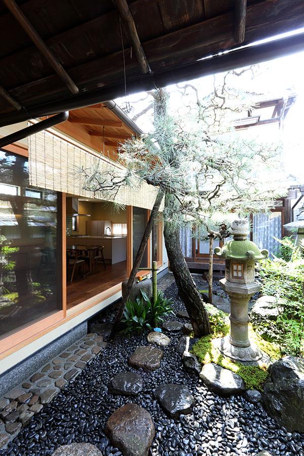 中庭を生かしたいという希望に応えた間取りは大きな松の眺めがすばらしく、リビングに自然光が注ぎます。