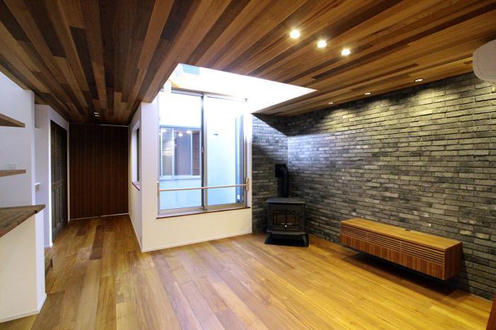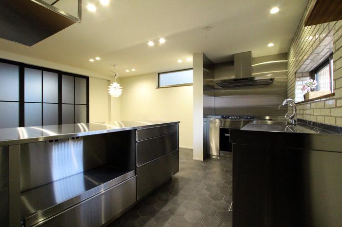 総ステンレスのシステムキッチンは、フランス家庭料理の教室を主宰される奥さまと、ともにつくりあげた、こだわりのキッチンスペース。中庭と吹抜を自然素材で有機的に連結し、都市の一角でありながら自然光あふれる開放的な空間を実現しています。