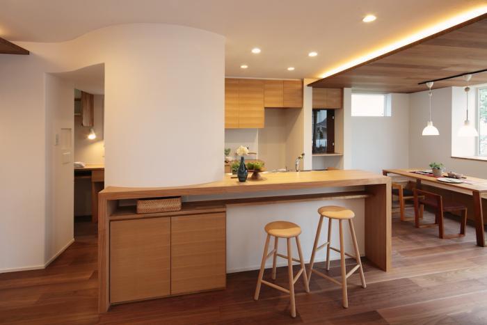レンジフード前の曲面の壁が部屋のアクセントになっています。