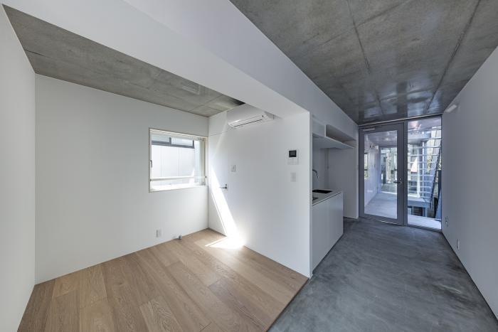 共用廊下と室内の土間とが一体的に連続するような設えとし、狭小でありながらも広がりを感じられる計画とした。