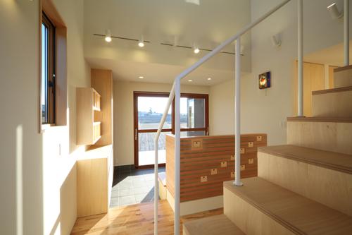 近隣の方々とのコミュニケーションがスムーズにいくよう、家の中に上がらずとも茶飲み話ができるような広々とした玄関土間をご提案しました。ゆっくり寛げるようベンチを配し、話のネタにもなるよう趣味の電車模型や絵を飾れる壁などを配置しました。また、土間空間の為、犬のお散歩仲間や、畑の土の付いた野菜などを持ってきて下さる近隣の方々も気を使わず来訪して頂けます。このプランは実際に功を奏し、近隣の方々が日々集まるちょっとしたコミュニティースペースになっているとの事です。