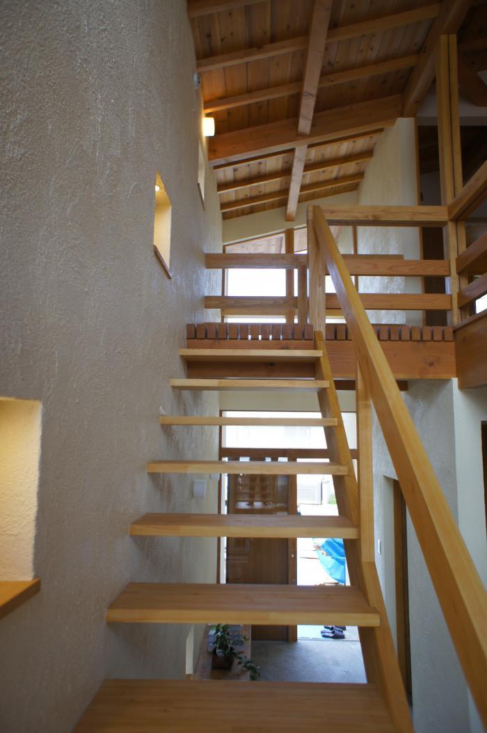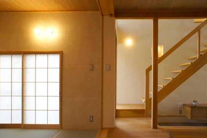 道路に面した竪格子や、袖うだつのごとく持ち出た外壁、和紙や漆喰など柔らかな素材仕上、通り庭のような土間を軸にした間取り。。。土地探し段階から建主に要望されていた「和」の暮らしや形を意識した住まいです。