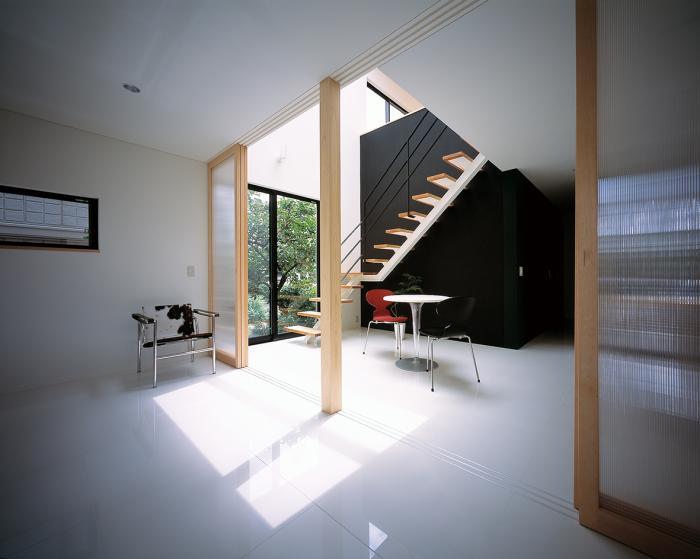 南北に細長く採光の取りにくい敷地の為、生活のメインとなるLDKを2階につくりました。家の中心にパティオを設け、各部屋をパティオに対して開くことで2階だけでなく1階北側にも十分な採光を確保しております。