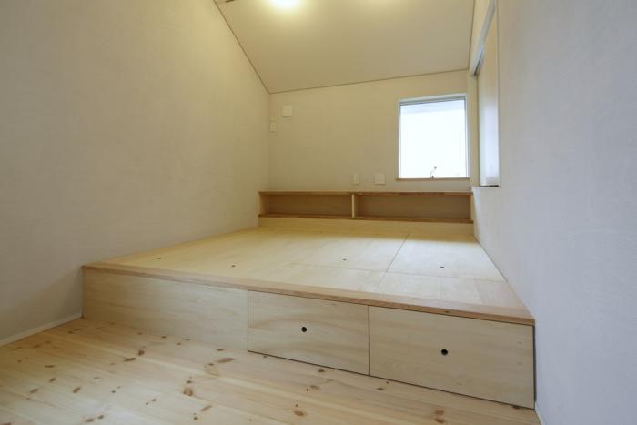 2階廊下を1間(1820ミリ)の広めの幅として、お子さんの勉強やご夫婦の読書スペースとなるよう設計しました。このファミリースペースから階段2段400ミリ上がった高さに寝室を設けました。